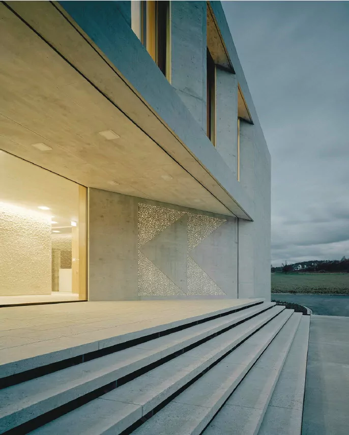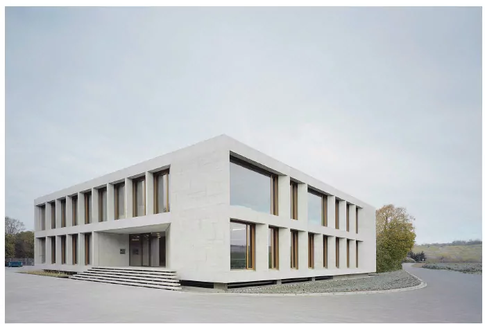 Den Entwurf dafür lieferten die Wittfoht Architekten aus Stuttgart, die für diesen weithin sichtbaren Ort einen klaren, architektonisch in sich ruhenden, zweigeschossigen Baukörper aus Sichtbeton entwickelten, der fortan als Visitenkarte für das Bauunternehmen fungiert.